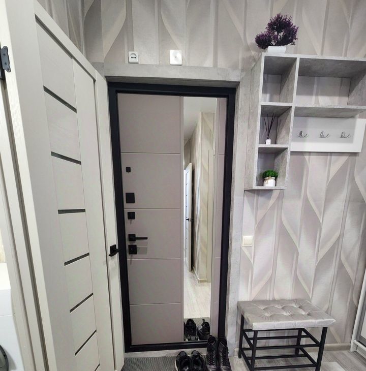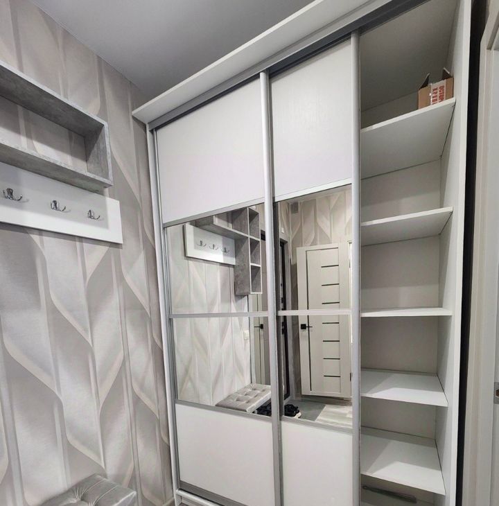 В прихожей большой встроенный шкаф для одежды и функциональные, глубокие полки.
