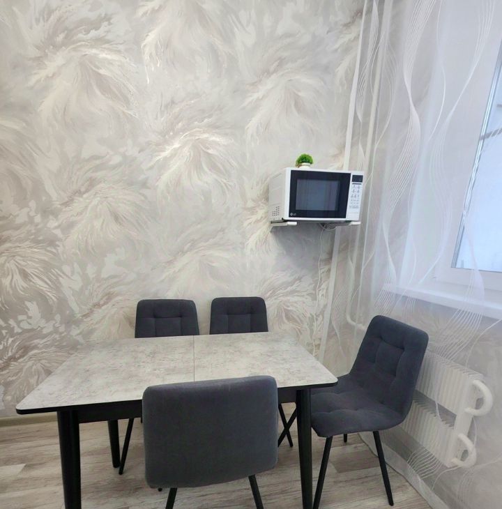 Кухня оборудована всей необходимой, качественной техникой и мебелью: варочная плита с духовым шкафом, вытяжкой, холодильником, микроволновой печью, обеденным столом и мягкими, велюровыми стульями.