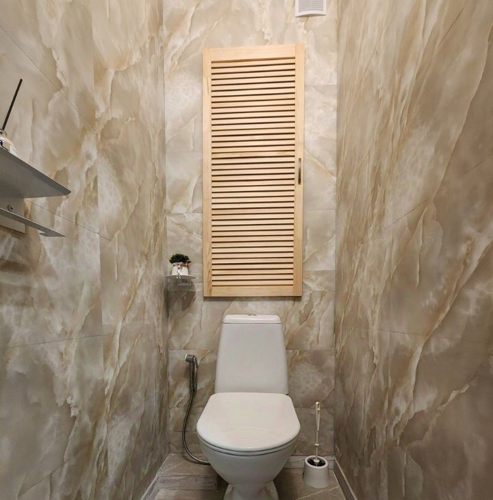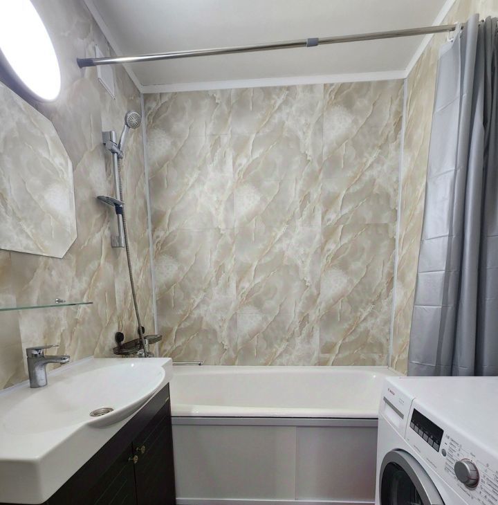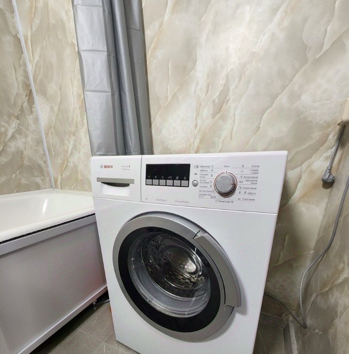 Санузел в светлых тонах и с качественной сантехникой, с функциональной стиральной машиной.