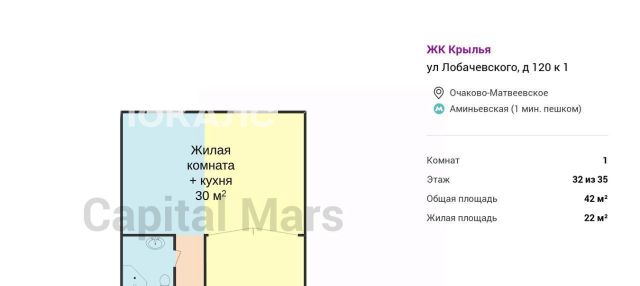 Предлагается 1-комнатная квартира общей площадью 42 м² в ЖК "Крылья" недалеко от станции метро "Аминьевская". Высокие потолки увеличивают пространство, наполняя его светом. Для комфортного проживания в наличии имеется вся необходимая мебель. Кухонный гарнитур оснащен посудомоечной машиной, духовой печью. Из дополнительных преимуществ - наличие лоджии. Окна обращены во двор, обеспечивая тишину.