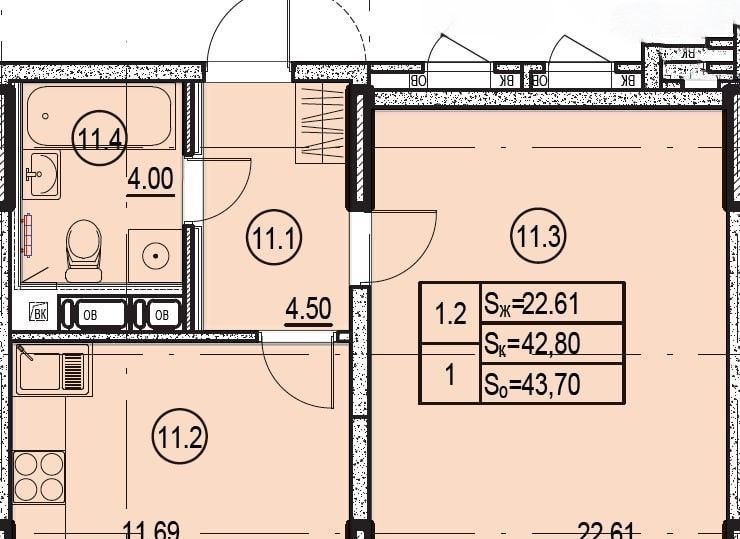 Квартира в новом доме, общей площадью 43.7 м2, кухня 11.7 м2, комната 22.6 м2, балкон.