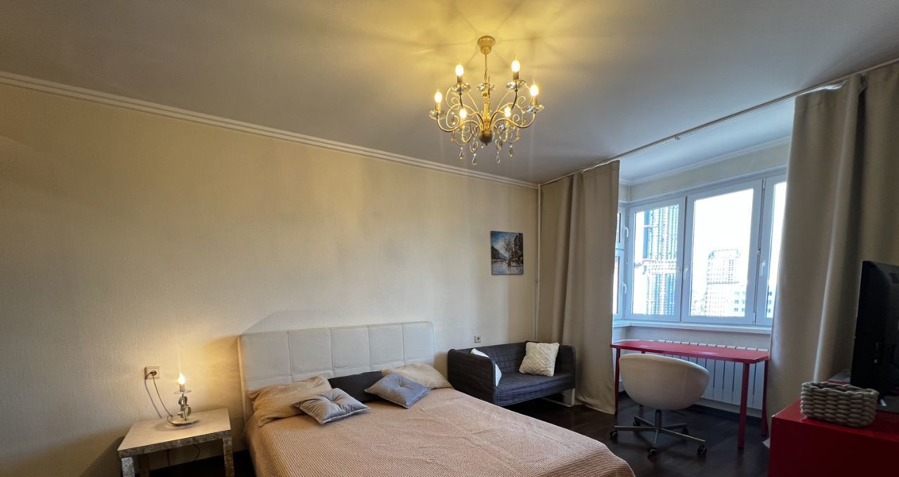 ЖК Мичурино. Монолитно-кирпичный дом бизнес класса, однокомнатная - студия в отличном состоянии на 18 этаже с панорамным видом из окон. Квартира после качественного евроремонта, полностью оборудована мебелью и бытовой техникой. На кухне встроенный кухонный гарнитур + остров под каменной единой столешницей со всей бытовой техникой (Siemens, Liebher) включая посудомоечную машинку и микроволновку. Обеденная группа - стол, стулья. В комнате кожаная двуспальная кровать, трехстворчатый шкаф, стеллаж, стол, телевизор Panasonic диагональ 42. Интернет и телевидение МГТС GPON (99 каналов). В прихожей шкаф, вешалка, зеркало, журнальный столик. Санузел совмещен, испанская плитка и керамогранит оборудован современной сантехникой Villeroy Bosh и Jacob Delafon краны и душевая система Grohe, из кухни выход на застекленную лоджию. Кондиционер. Шикарная входная группа, видеонаблюдение, консьерж, шлагбаум. На территории комплекса есть спортивные площадки, магазины, остановка транспорта 5 мин. До метро 10 минут пешком. Удобная транспортная развязка. Квартира сдается на длительный срок, краткосрочная аренда на несколько месяцев обсуждается отдельно. Предпочтение стабильным платежеспособным клиентам, рассмотрим всех без детей и любых животных. Звоните, оперативный показ.