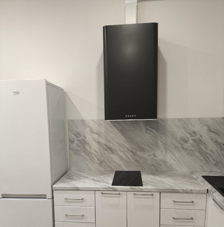 Кухня 17 метров, кухонный гарнитур, вытяжка , варочная панель, холодильник,обеденная группа (стол, стулья).