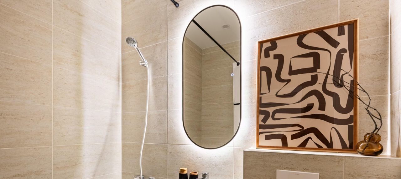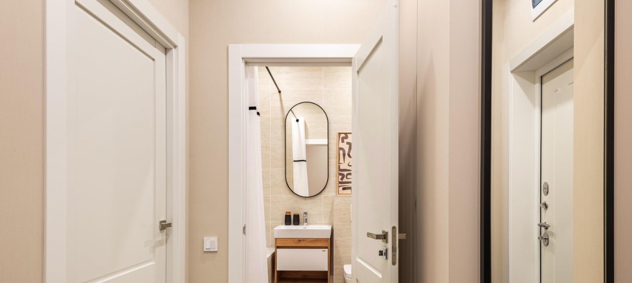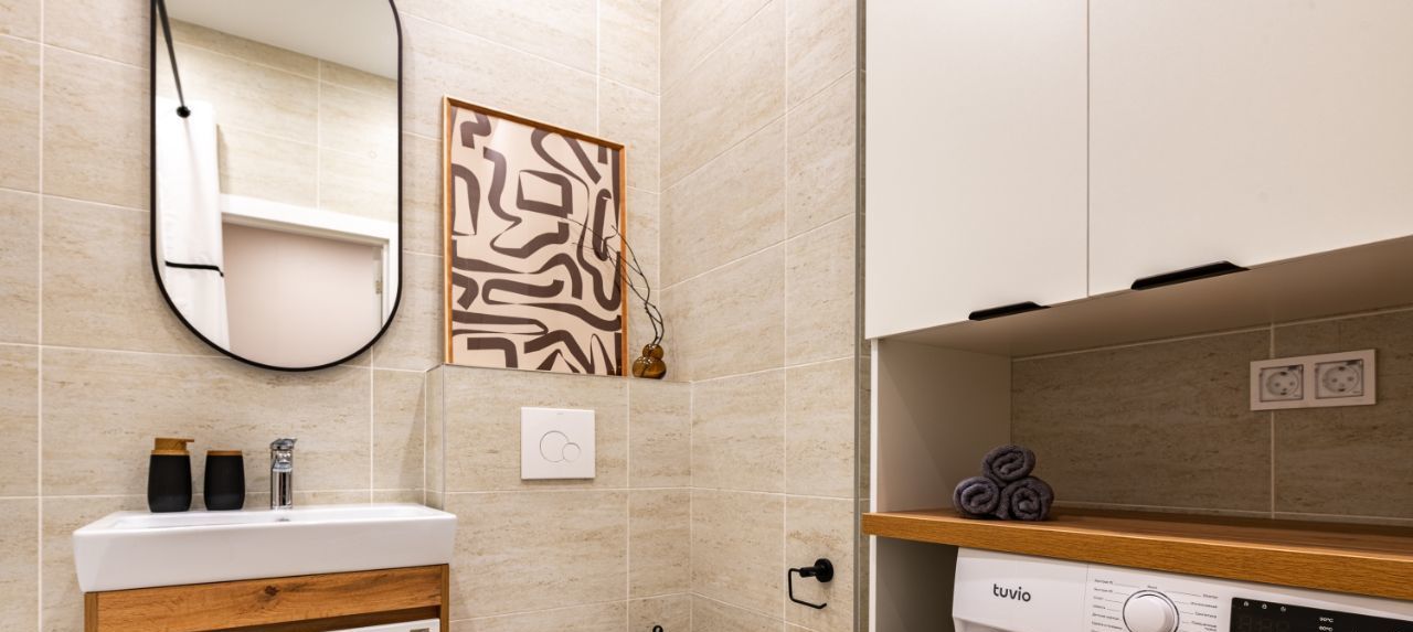 Квартира с дизайнерским ремонтом, оборудована всем необходимым для комфортного проживания. На кухне имеется современная мебель и вся необходимая техника: холодильник, посудомоечная машина. В квартире также есть кондиционер, телевизор и стиральная машина. Ванная комната оснащена ванной. Совмещённый санузел выполнен в современном стиле.
