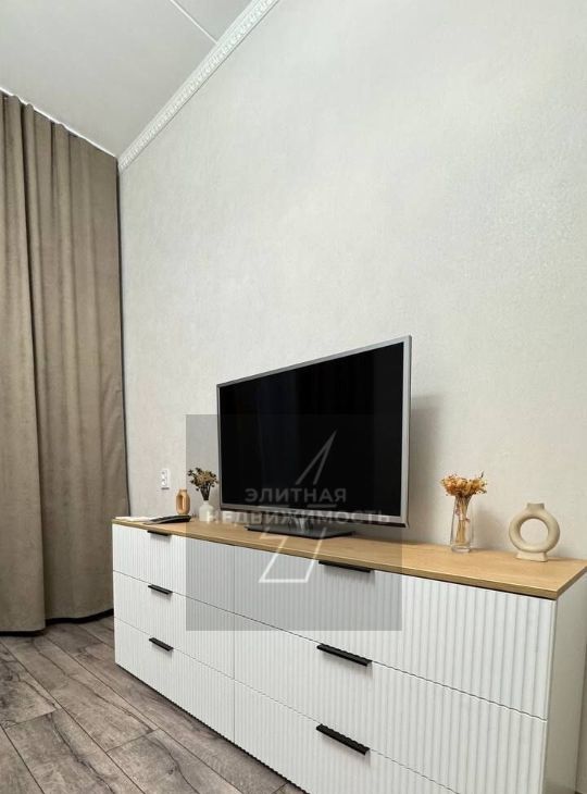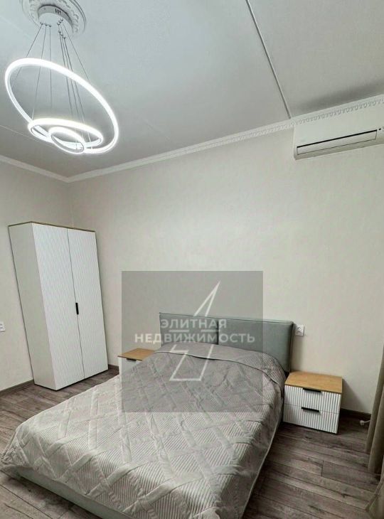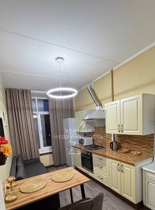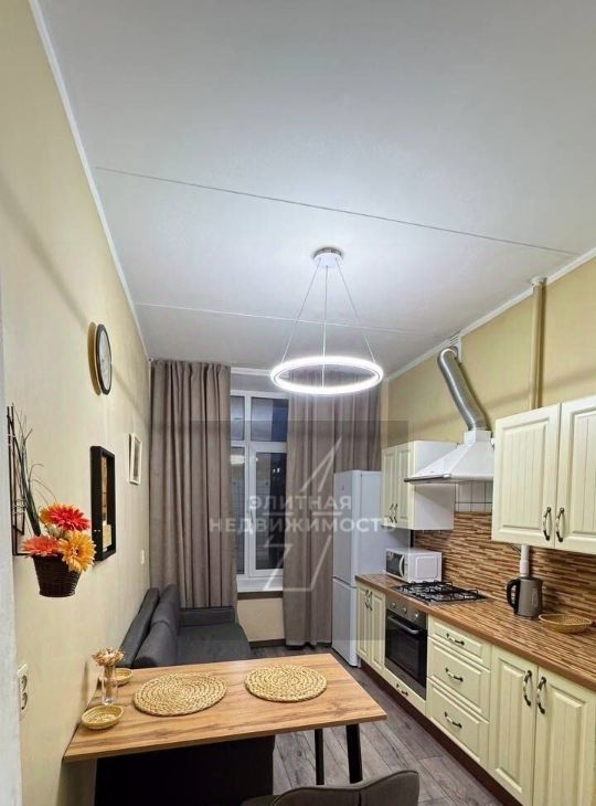 В квартире базовый набор мебели: кровать, два шкафа (один встроенный) и тумбы,комод; кухня обставлена полностью. Из техники — телевизор,кондиционер, стиральная машинка, холодильник, микроволновка,газовая варочная поверхность и духовой шкаф .