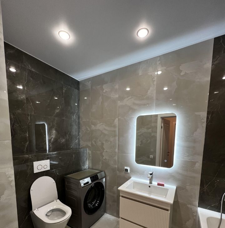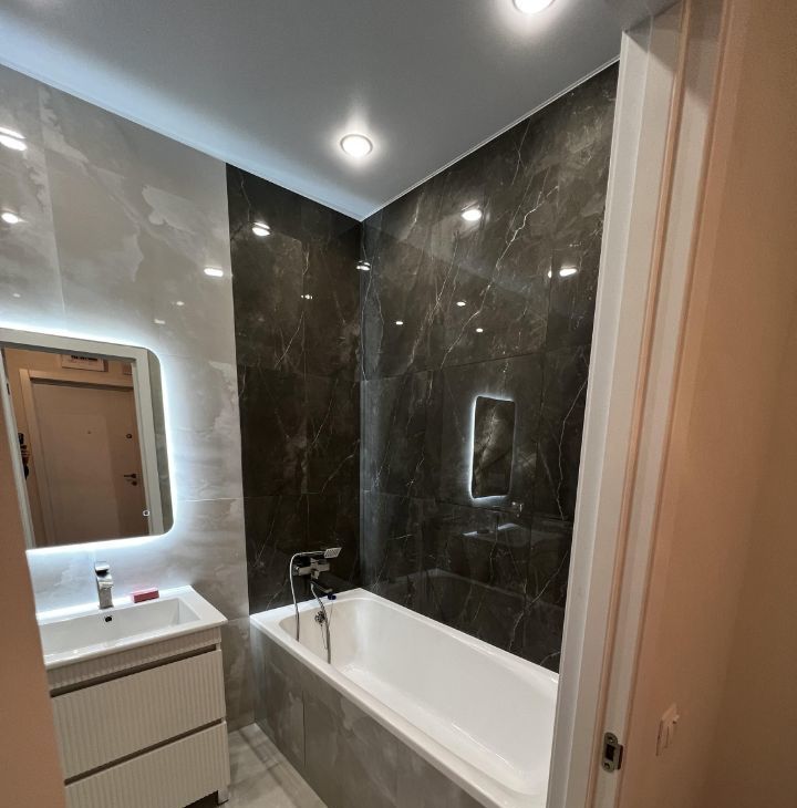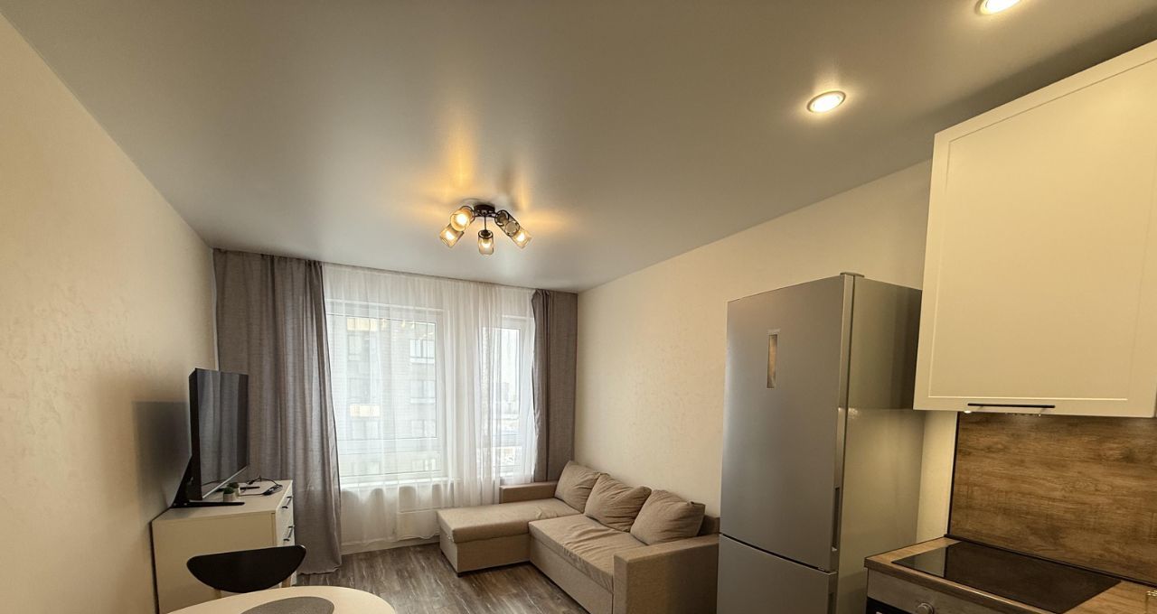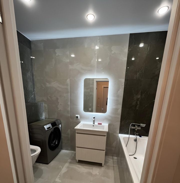 Квартира полностью меблирована: в комнате и на кухне есть всё необходимое для комфортного проживания. Из техники установлены кондиционер, холодильник, посудомоечная машина, телевизор и стиральная машина. Планировка включает совмещённый санузел с ванной, что позволяет расслабиться после рабочего дня.