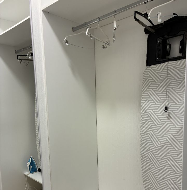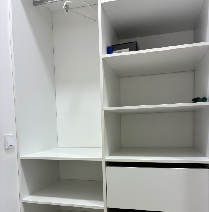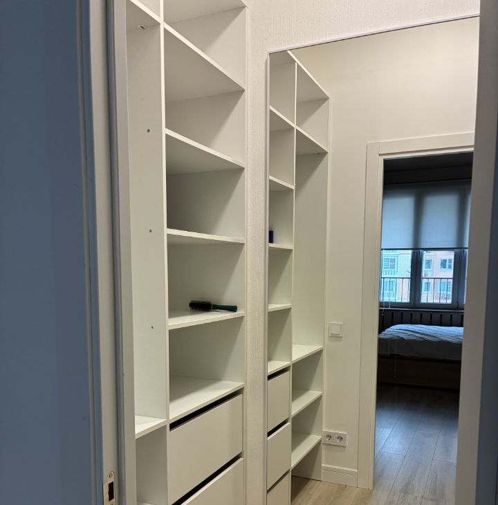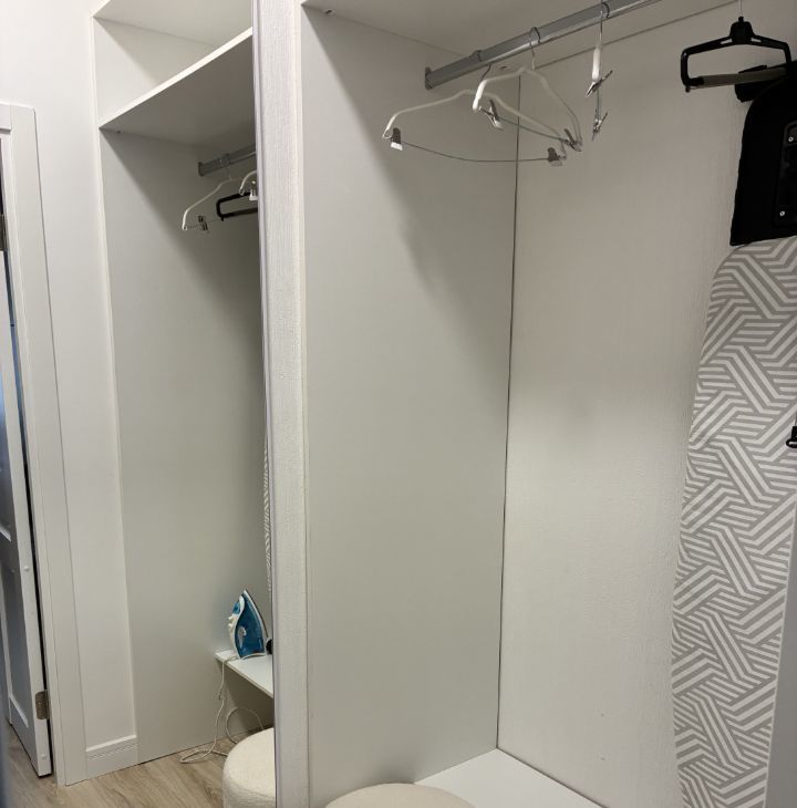 Просторная гардеробная, ванная комната оснащена современной ванной. открывается вид на тихий двор, а также имеется лоджия, где можно устроить зону