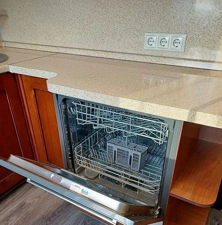 Kухня оборудована встроенной техникой, варочная панель, духовой шкаф, новая посудомоечная машина, кухонный стол/табуретки + большой холодильник в прихожей.