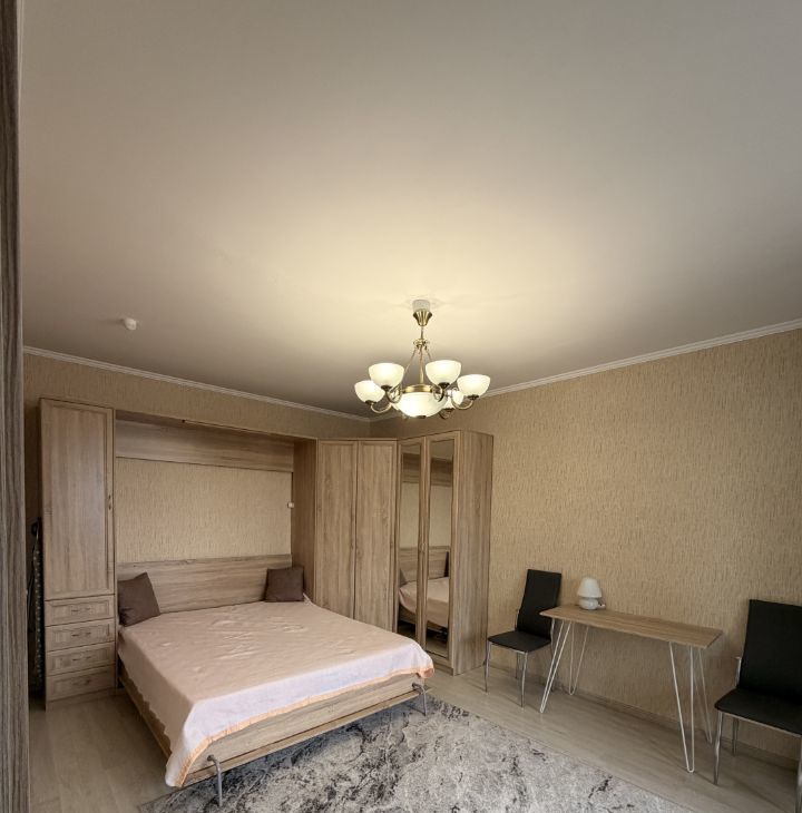 Изолированная спальня с большой лоджией с панорамным видом, практичная мебель трансформер с двуспальной кроватью, совмещенный с/у и просторная прихожая.