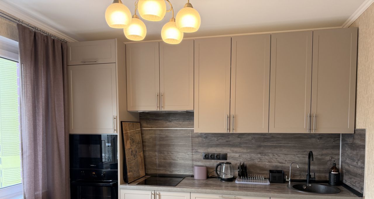 В квартире установлен кухонный гарнитур со встроенной техникой (Индукционная плита, духовой шкаф, микроволновая печь, вытяжка).