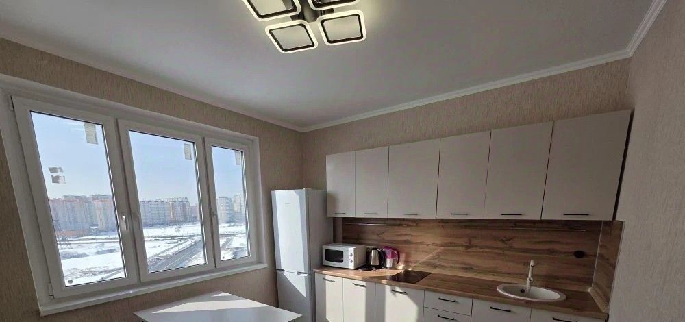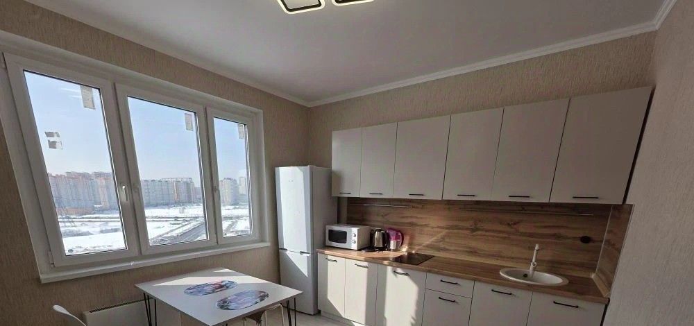 Сдаётся просторная однокомнатная (40 кв.м) квартира в современном доме с большой кухней 12 кв. метров (большой двухкамерный холодильник, микроволновка, Эл.чайник, Эл.плита, мебель кухонная,