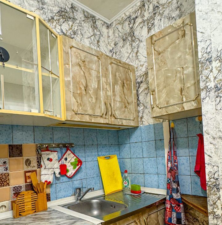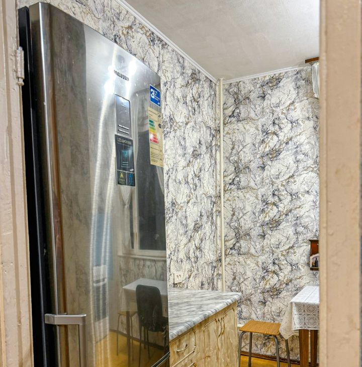 Кухня площадью 8 мг оборудована необходимой бытовой техникой, включая холодильник и плиту. Из мебели - вместительные шкафы и диван. В комнате установлен телевизор.