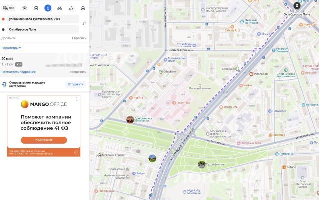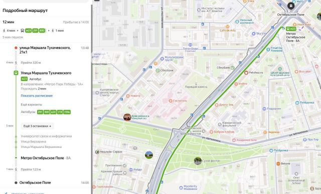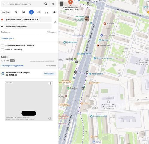 До м. Октябрьское поле 10-15 мин на общественном транспорте, пешком минут 20 и 15 минут до м. Народного ополчения