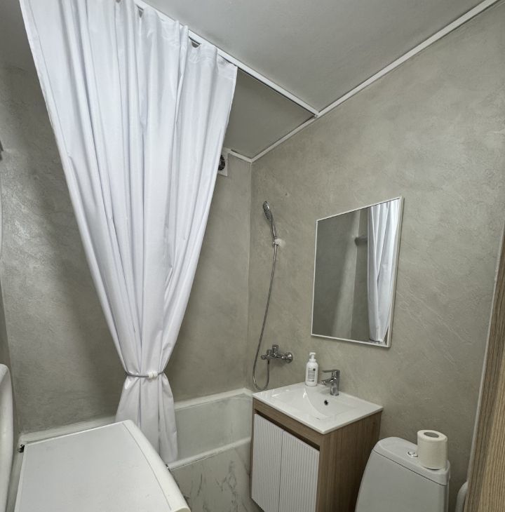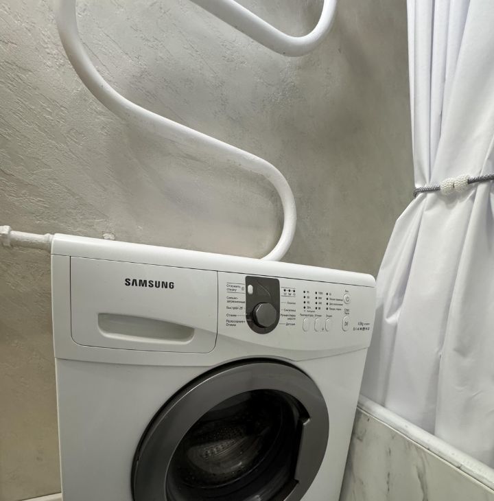 Кухня компактная, но функциональная, оснащена современной бытовой техникой, включая холодильник и варочную поверхность. Совмещенный санузел оформлен в светлых тонах, в нем установлен стиральная машинка.