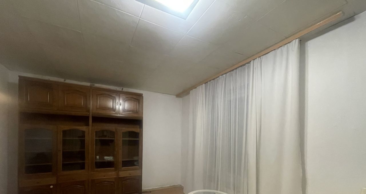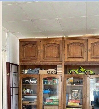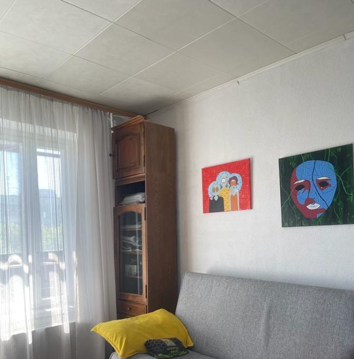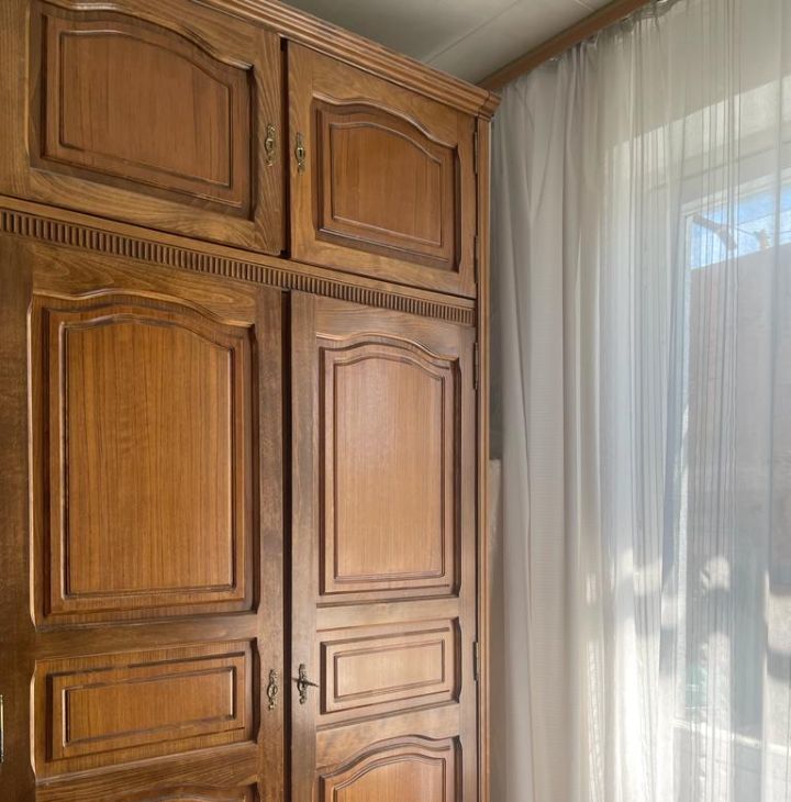 Обстановка комнаты: финская мебель из натурального дерева с большим количеством мест для хранения одежды (жилая стенка с трехстворчатым платяным шкафом, книжный шкаф/сервант; отдельная секция для хранения верхних вещей ). Белый журнальный столик со стеклянной столешницей. Настенный ж/к телевизор (будет закрепллен).