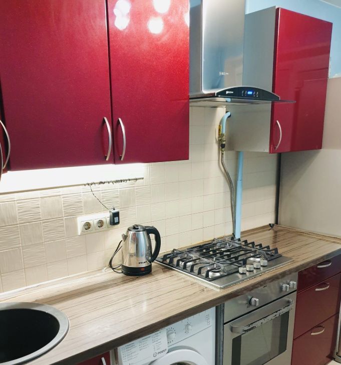 На кухне: встроенный гарнитур, холодильник, стиральная машина, мелкая бытовая техника, кресло-кровать.