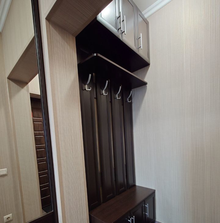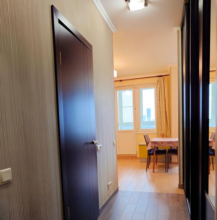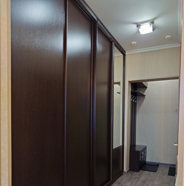 В прихожей огромный шкаф-купе. Панорамный вид из окон.