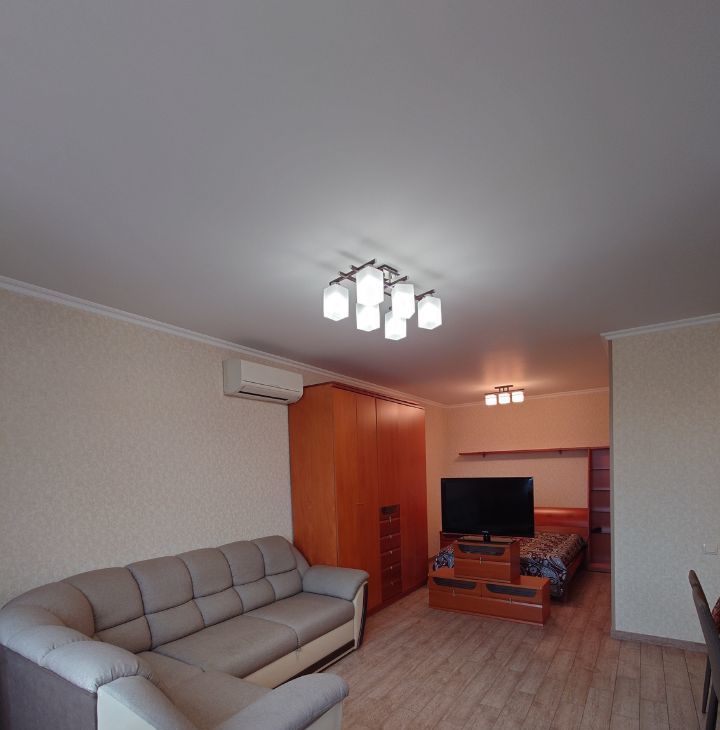 Просторная светлая гостиная, комфортное зонирование со спальней.