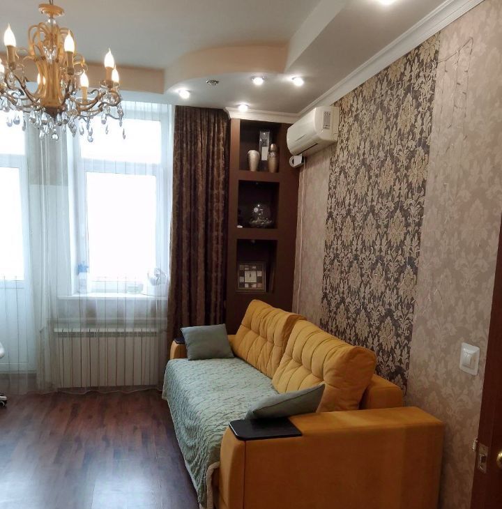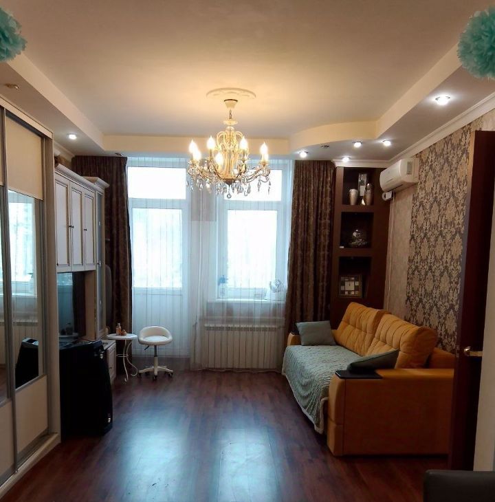 Сдаётся однокомнатная квартира в сталинском доме на третьем этаже на длительный срок. Общая площадь 52 м, жилая площадь 25 м. Большая светлая комната, диван -полноценное двуспальное место, телевизор, ещё один диван на кухне. Мебель и техника остаётся в квартире. Eсть балкон. Большая кухня, дополнительное спальное место. Большая входная зона и коридор.
