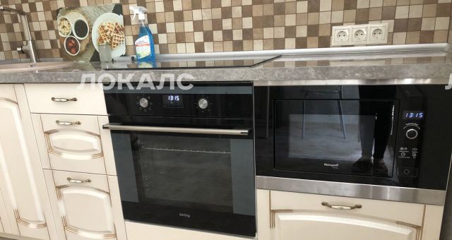 Кухонный гарнитур с доводчиками дверей в светлых тонах, столешница сделана из искусственного камня. Техника встроенная: варочная панель, духовой шкаф, микроволновка, вытяжка. Холодильник 2-х камерный, стоит в нише в прихожей, но можно его по желанию переместить на кухню. Обеденный стол, стулья. Выход на балкон с кухни. Окна на улицу. В комнате диван, тумба под телевизор, телевизор с плоским экраном. ПРИХОЖАЯ: