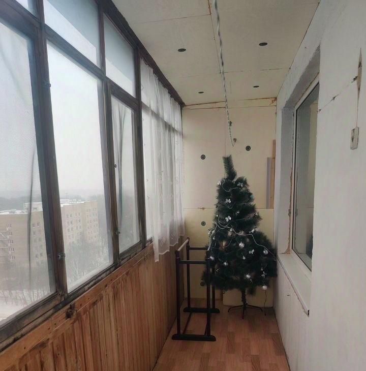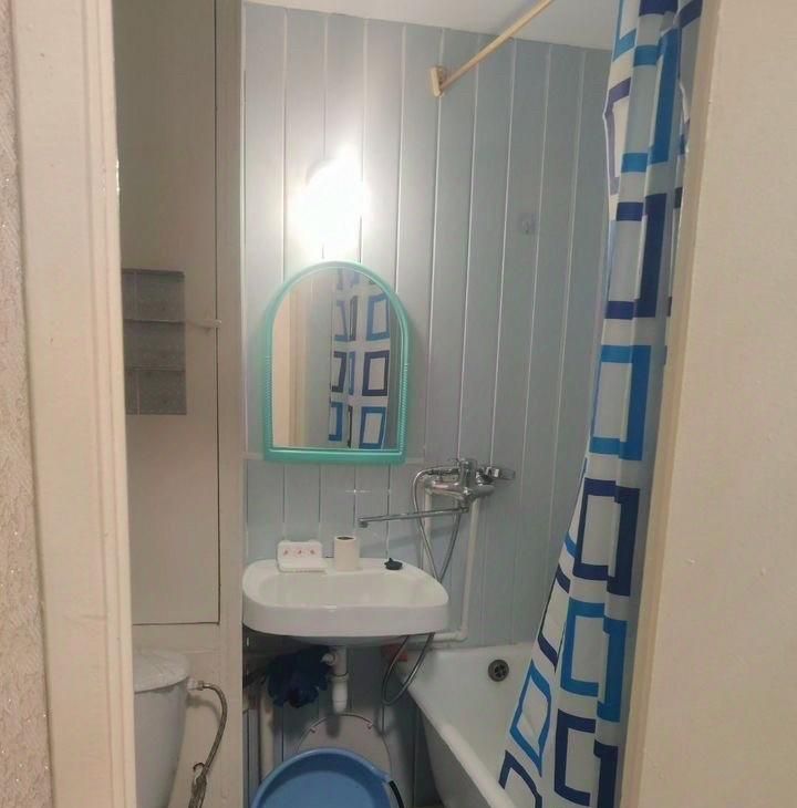 В комнате установлен телевизор, а также имеется выход на застекленную лоджию с видом на город. Санузел совмещенный, оформлен в светлых тонах.