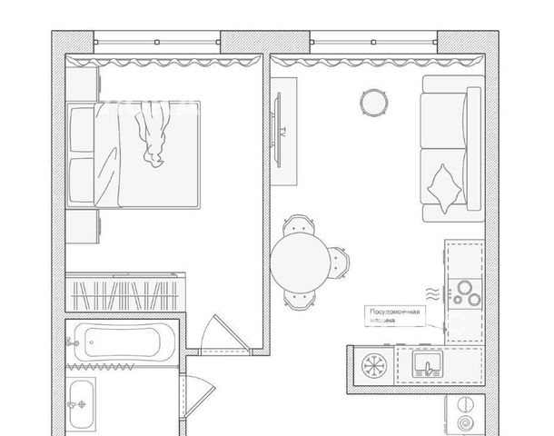 - Уютная кухня с обеденной зоной, диваном и телевизором;