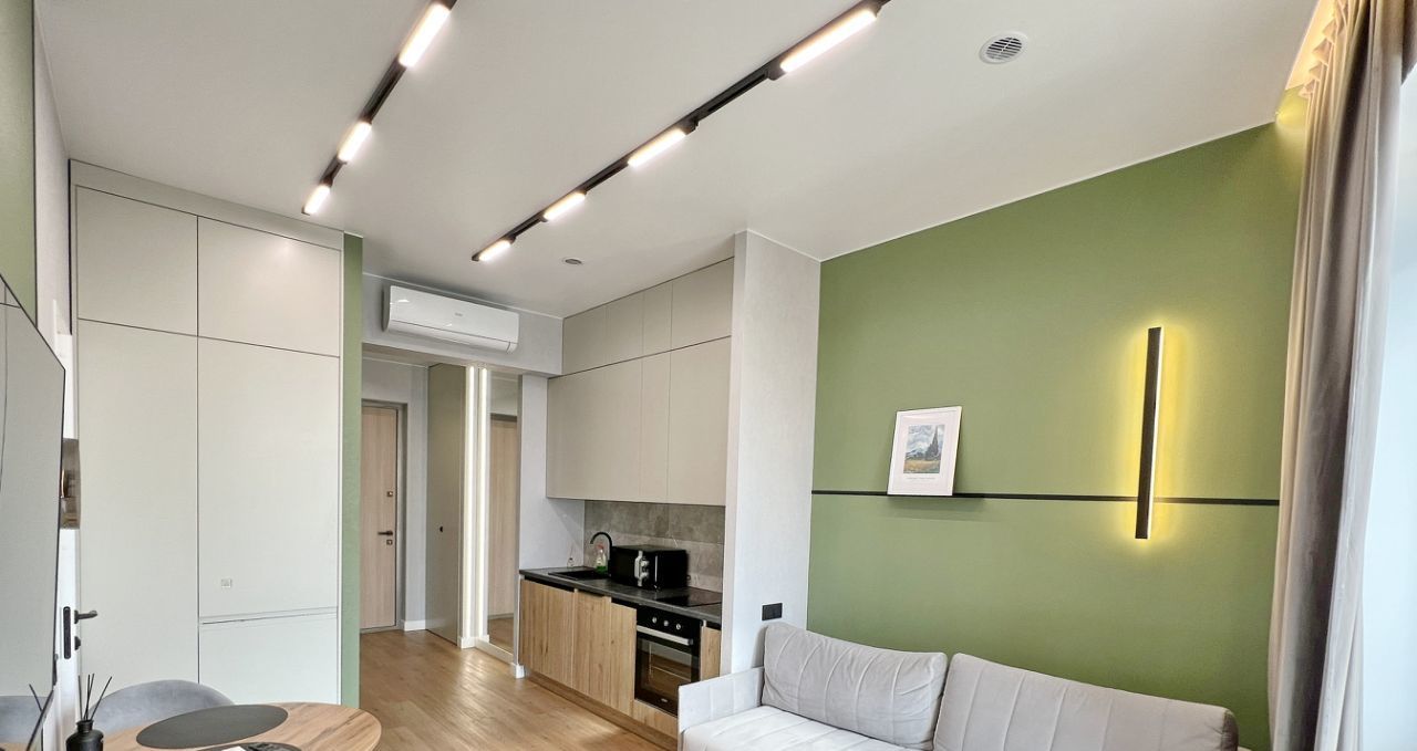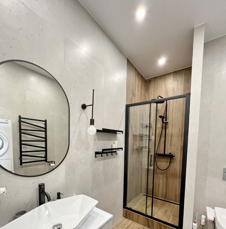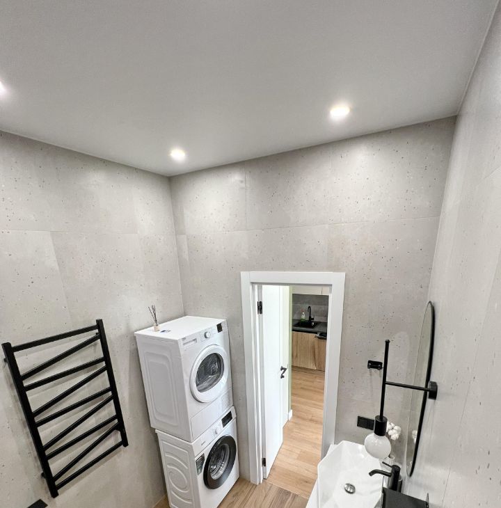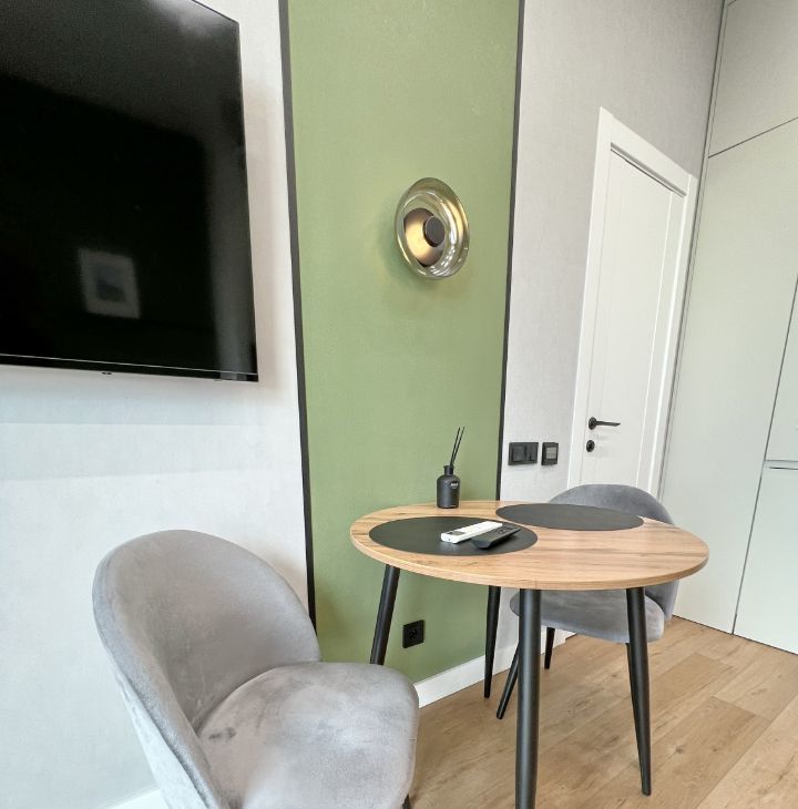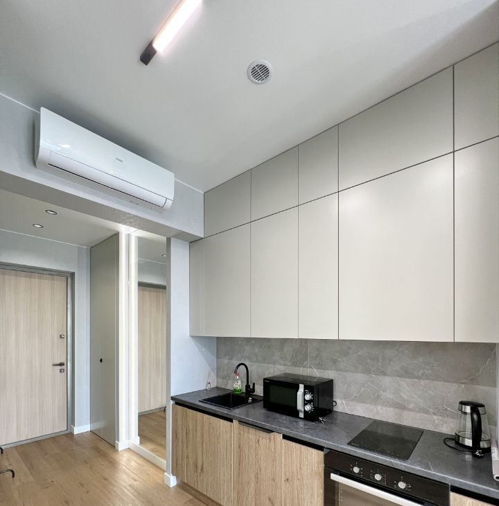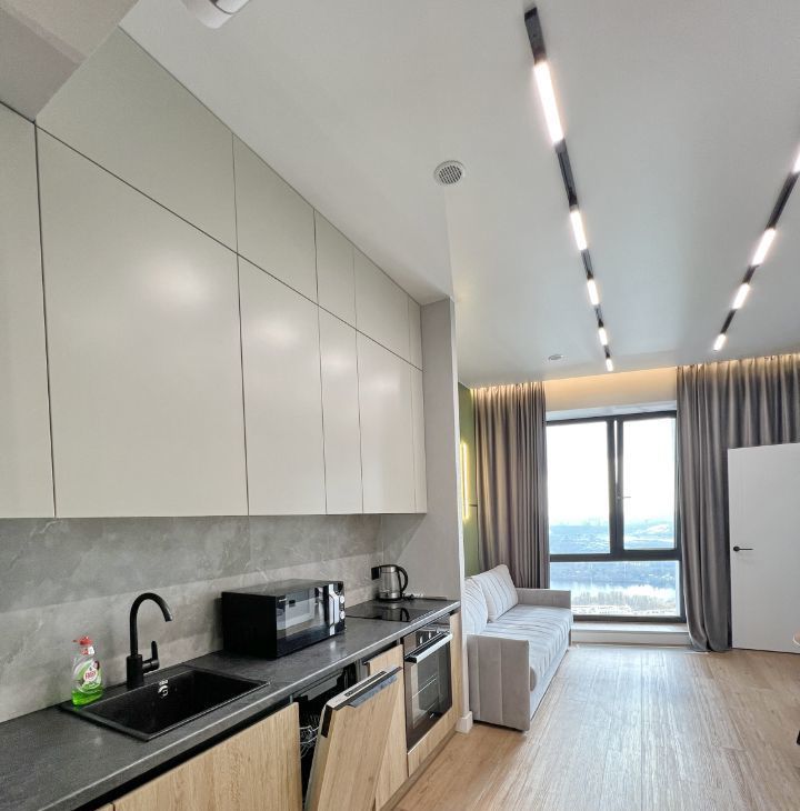 Площадь квартиры - 33.4м2, окна в пол, просторная кухня-гостиная со всей необходимой техникой и мебелью (встроенный 2х камерный холодильник, ПММ, варочная панель, ТВ, духовой шкаф, СВЧ, кондиционер, раскладной диван, обеденный стол и стулья). Изолированная комната, двух спальная кровать с прикроватными "парящими" тумбами, встроенный платяной шкаф. С/у со стиральной машиной и сушилкой, душевая кабина, умное биде-сиденье для унитаза Smartmi. Интернет - 600р в мес. 500мб/с.
