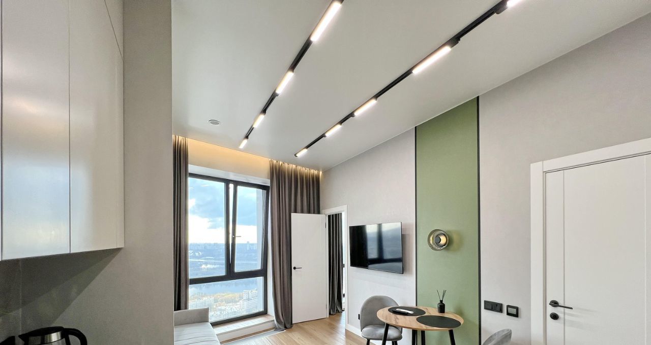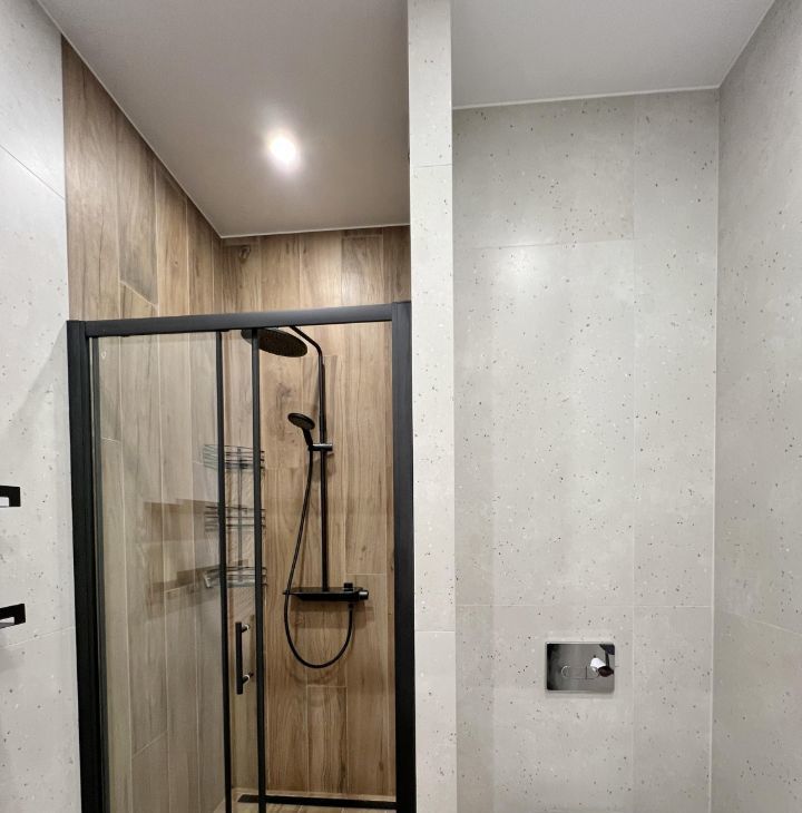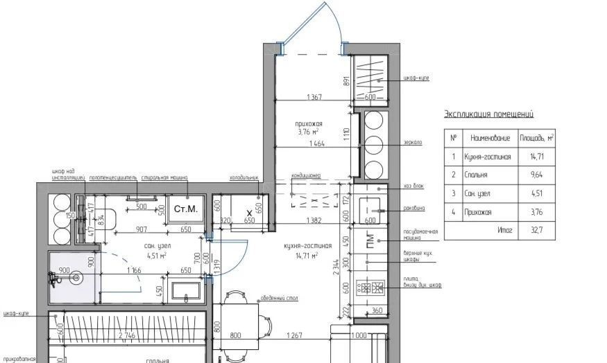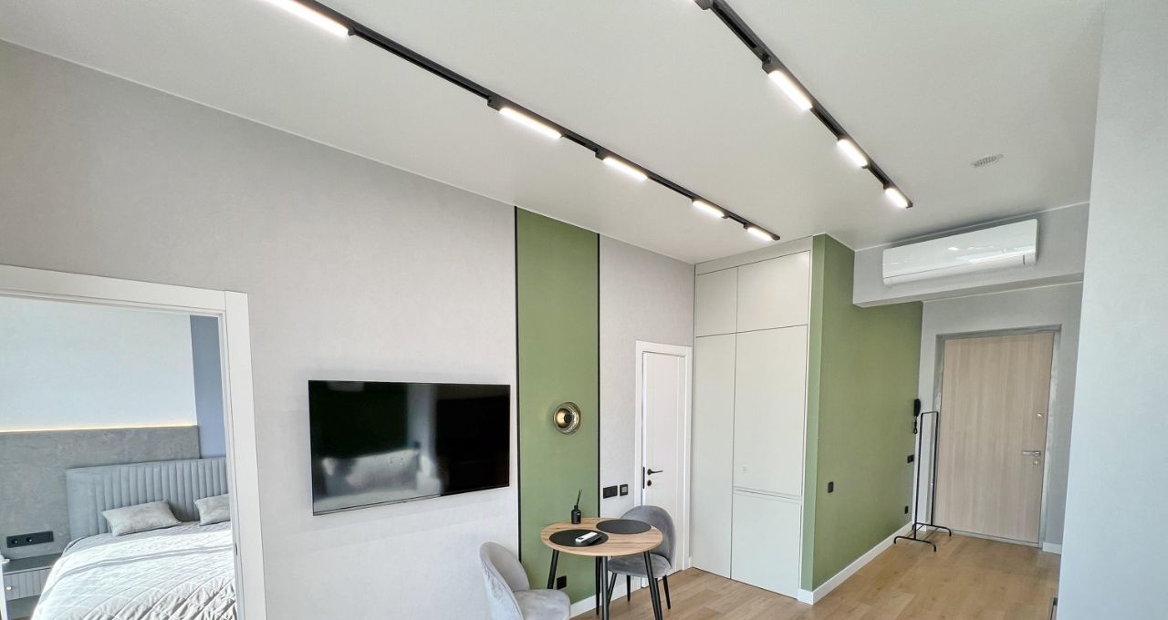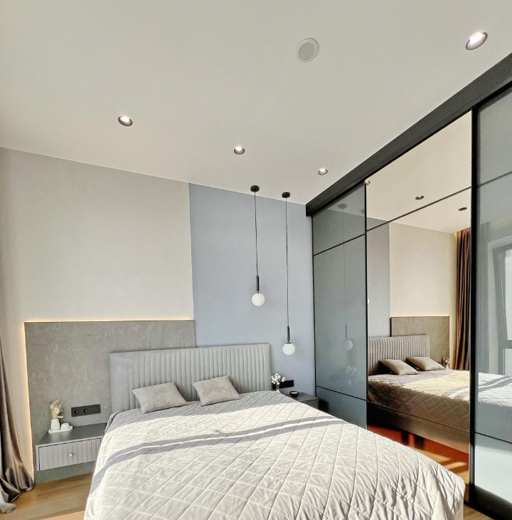 Площадь квартиры - 33.4м2, окна в пол, просторная кухня-гостиная со всей необходимой техникой и мебелью (встроенный 2х камерный холодильник, ПММ, варочная панель, ТВ, духовой шкаф, СВЧ, кондиционер, раскладной диван, обеденный стол и стулья). Изолированная комната, двух спальная кровать с прикроватными "парящими" тумбами, встроенный платяной шкаф. С/у со стиральной машиной и сушилкой, душевая кабина, умное биде-сиденье для унитаза Smartmi. Интернет - 600р в мес. 500мб/с.