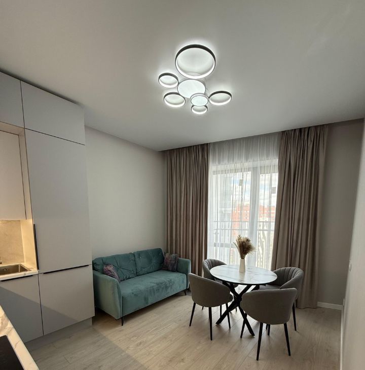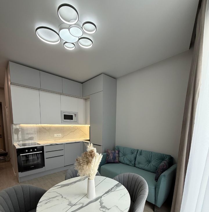 Сдается стильная однокомнатная квартира с дизайнерским ремонтом в современном жилом комплексе. Общая площадь — 36,9 кв. м, жилая — 16 кв. м, кухня — 12 кв. м. Квартира расположена на 17 этаже 62-этажного монолитного дома, построенного в 2022 году. Высокие потолки в 3,1 метра и окна, выходящие во двор, создают атмосферу комфорта и уюта.