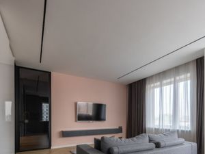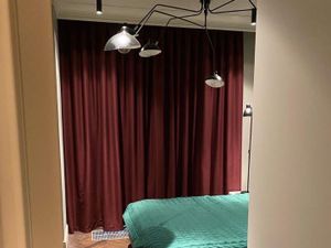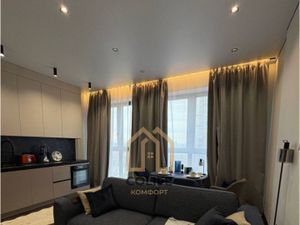 В спальне — большая кровать, прикроватные тумбочки, стеклянная перегородка. Гостинная совмещена с кухней. Кухня полностью оснащена техникой. В гостинной новый комфортный диван. Полноценная гардеробная комната, предусмотрено рабочее место. Открытый балкон.