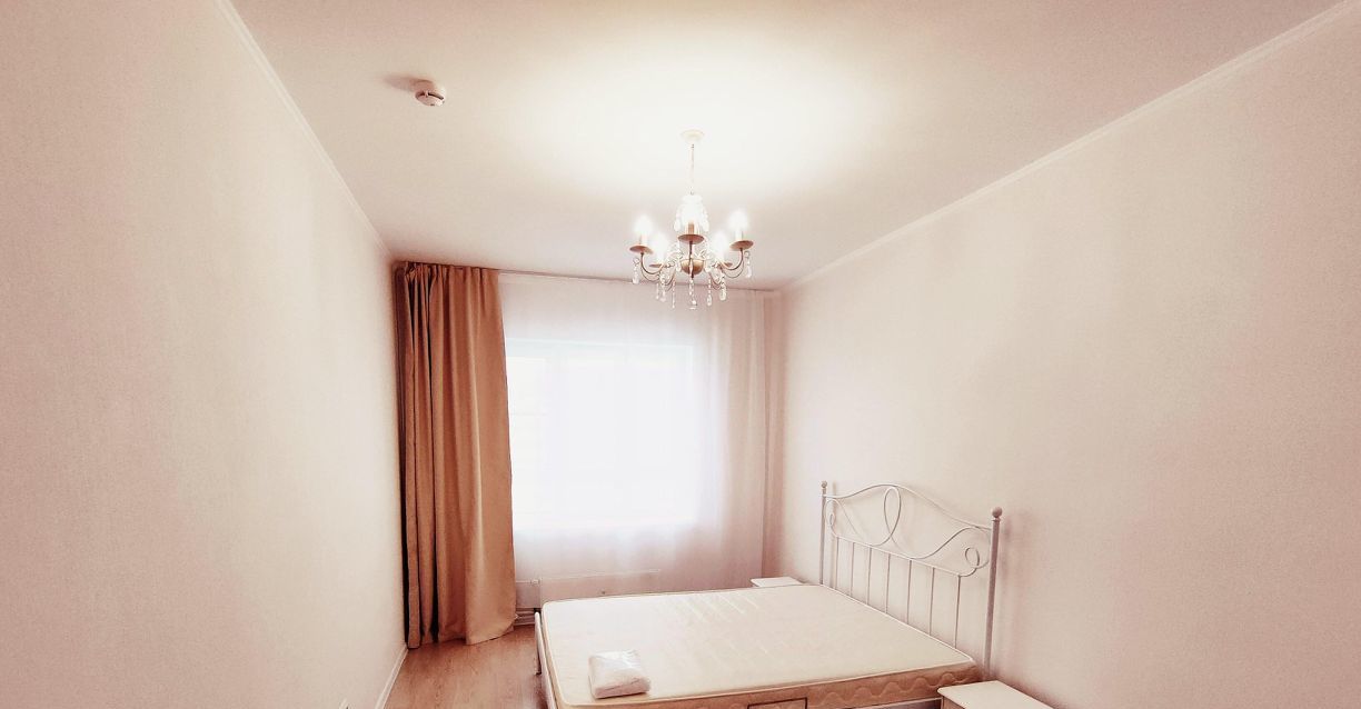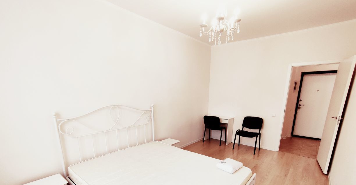 Большая комната и кухня, есть гардеробная. Квартира полностью мебелирована, качественный кухонный гарнитур и техника, большая металлическая кровать сделана на заказ.