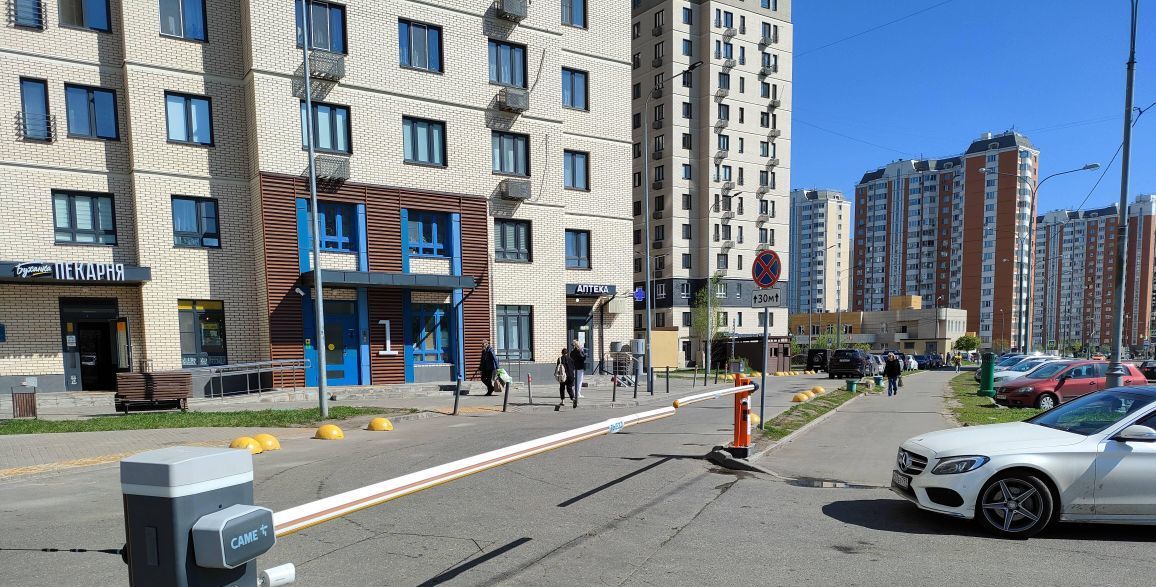 На территории большая наземная парковка за шлагбаумами. Во дворе магазины.