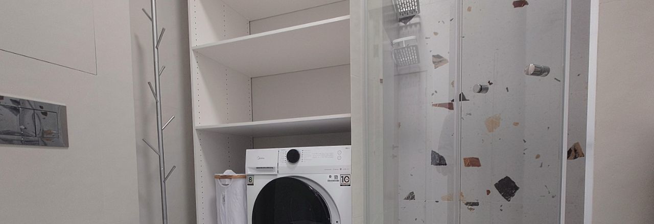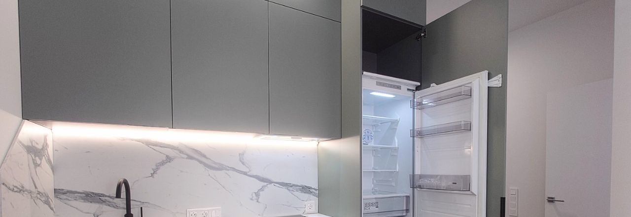 Двуспальная кровать 160 см, диван раскладной, платяной шкаф, кухонный гарнитур, электрическая варочная панель, микроволновая печь/духовой шкаф, холодильник, чайник, стиральная машина, посудомоечная машина, кондиционер, телевизор, теплые полы в санузле.