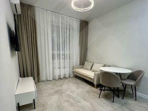 -кухня совмещена с гостиной, оборудована премиальной современной техникой, включая кондиционер, холодильник, микроволновку, духовку, индукционную плиту, посудомоечную машину, телевизор.