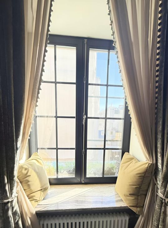 Квартира выходит на все 4 стороны, спальня и хозяйский санузел во двор, часть гостиной на Храм Христа Спасителя. В спальне и гостиной шторы black out, максимально продумана система хранения.