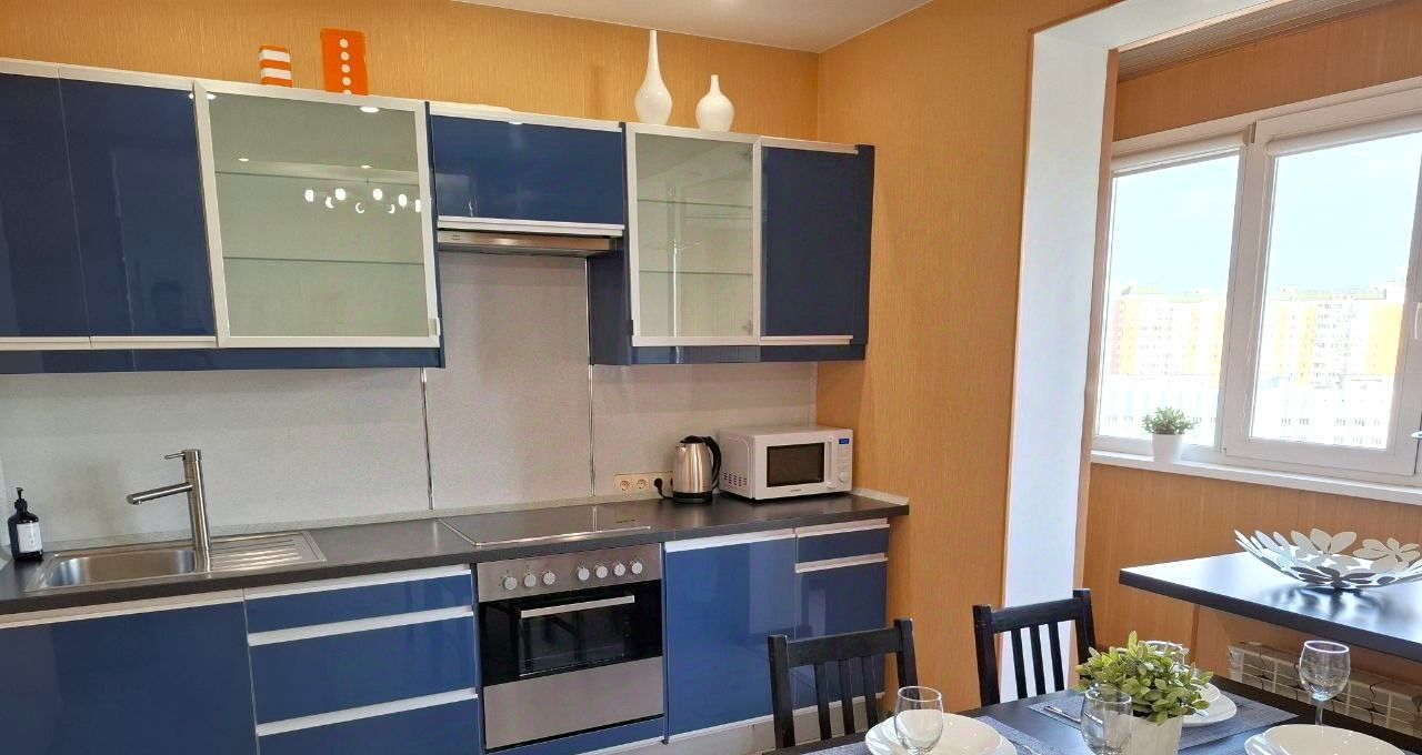 • Современная кухня с гарнитуром и встроенной техникой: полноразмерный холодильник, электрическая варочная плита, духовой шкаф, микроволновка, электрический чайник.
