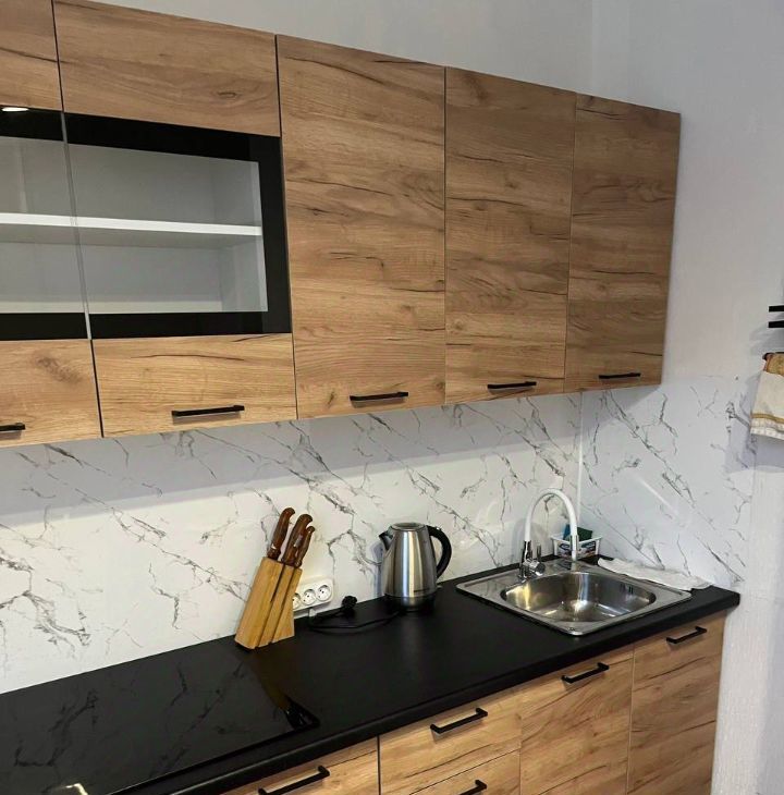 — Современный гарнитур с фасадами под дерево, чёрная столешница, встроенная вытяжка