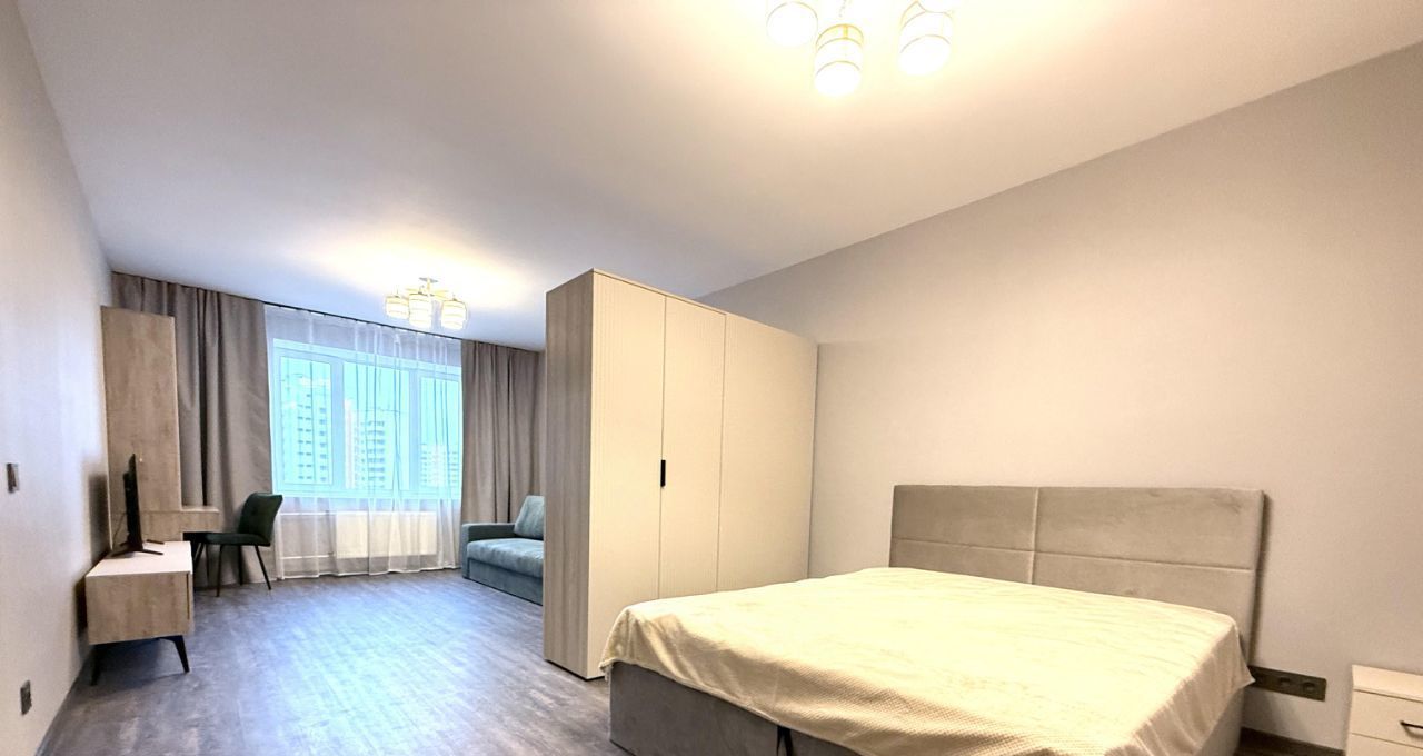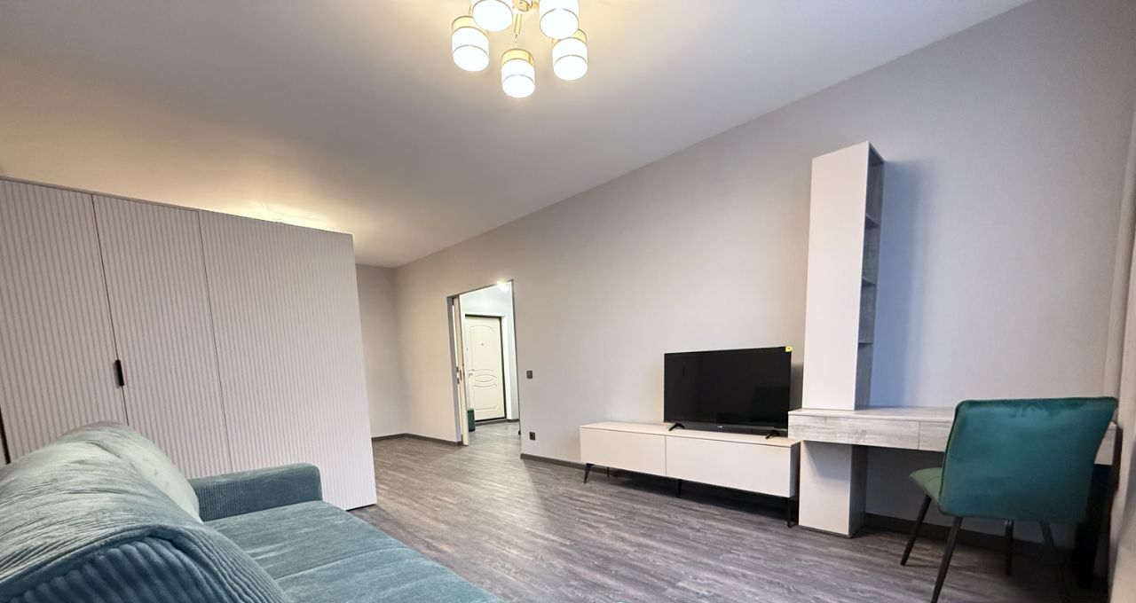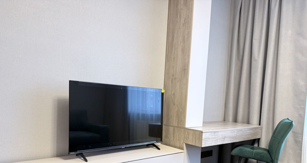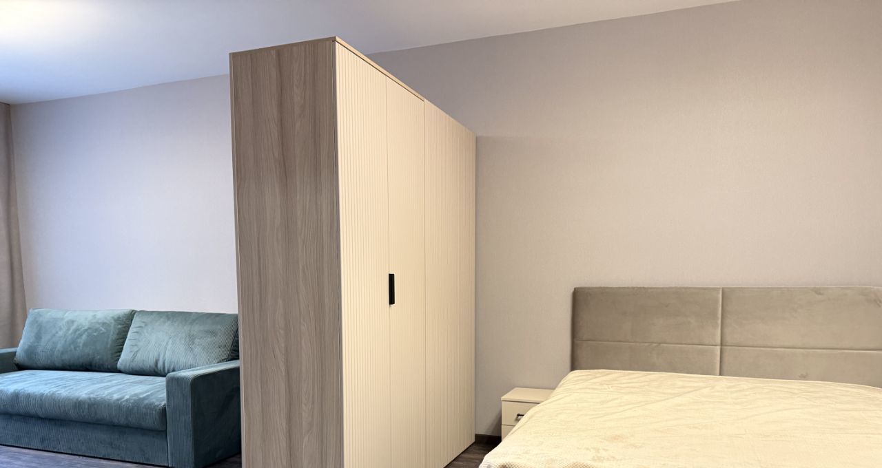 Основная комната удобно поделена шкафом на спальную зону и гостиную. Есть стол для ноутбука и возможность организовать рабочее пространство.