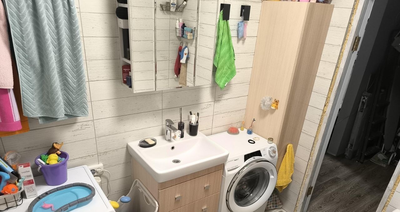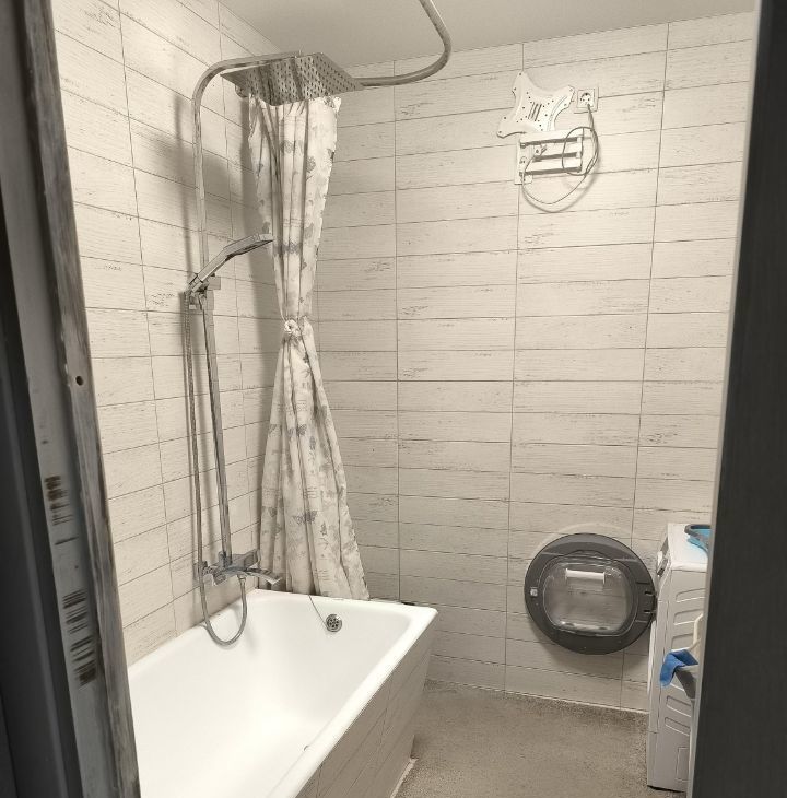 В ванной ТВ. Чугунная ванна 180 см. Подвесной унитаз. Подогрев пола. Стиральная и сушильная машина.