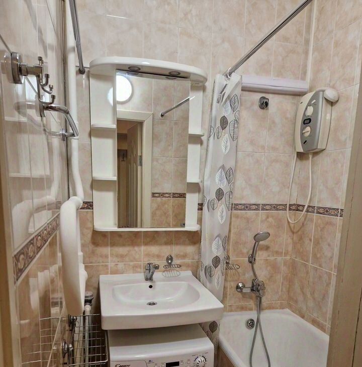 Планировка - изолированная спальня, санузел совмещенный. Квартира полностью укомплектована всей необходимой для проживания мебелью и техникой ( кондиционер, холодильник, плита, микроволновка, стиральная машина, посудомоечная машина, водонагреватель, телевизор). Есть возможность приобретения мебели под арендатора. Окна выходят во двор. Стихийная парковка во дворе.