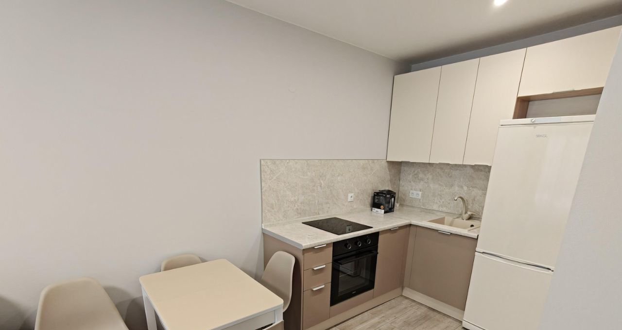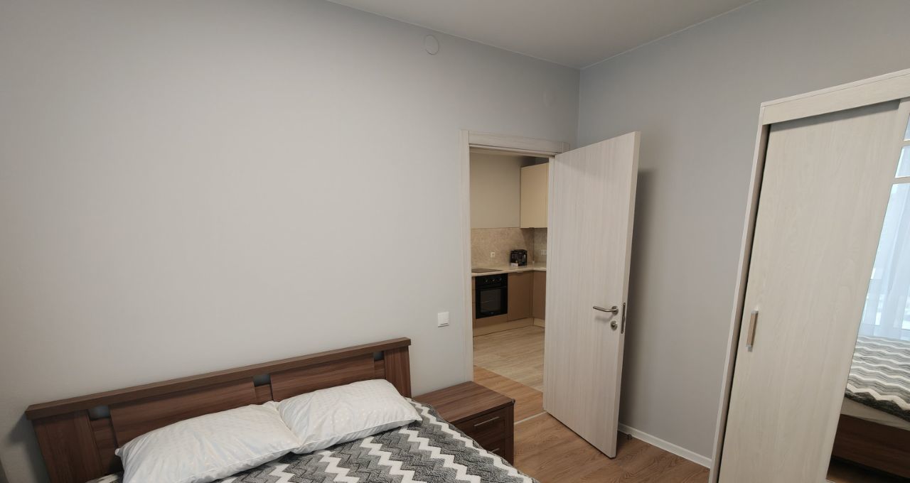 Из мебели в комнате — вместительный шкаф кровать, прикроватная тумба. Кухня оборудована всем необходимым: холодильник, плита, варочная панель, посудомоечная машина, чайник.