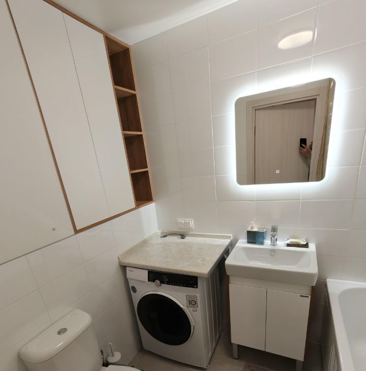 Санузел совмещённый, оформлен в светлых тонах, оснащён сантехникой , стиральной машинкой с функцией сушки, шкафами и полочками для всего необходимого. В прихожей предусмотрен шкаф для хранения вещей, вай фай роутер.