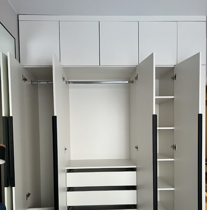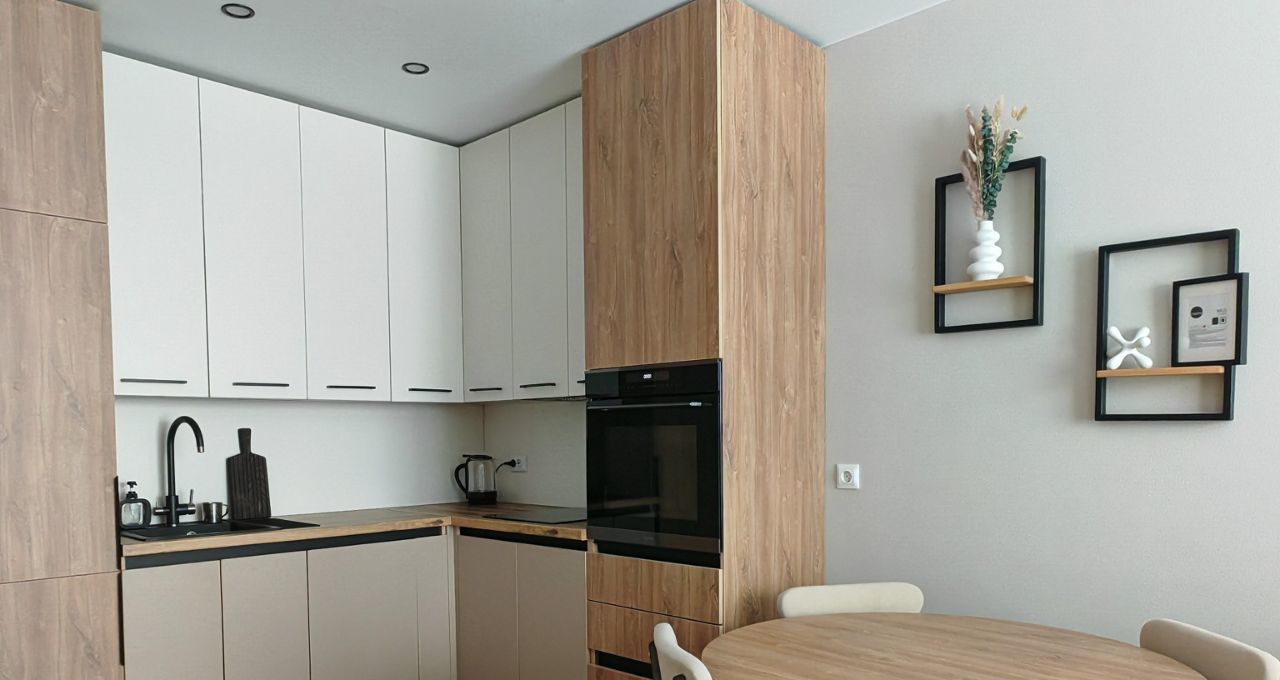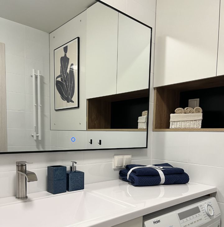 Полностью укомплектована новой мебелью и техникой (кондиционер, телевизор, посудомоечная машина, духовой шкаф + СВЧ, встроенный холодильник, варочная панель, вытяжка, электрический чайник, стиральная машина с сушкой).