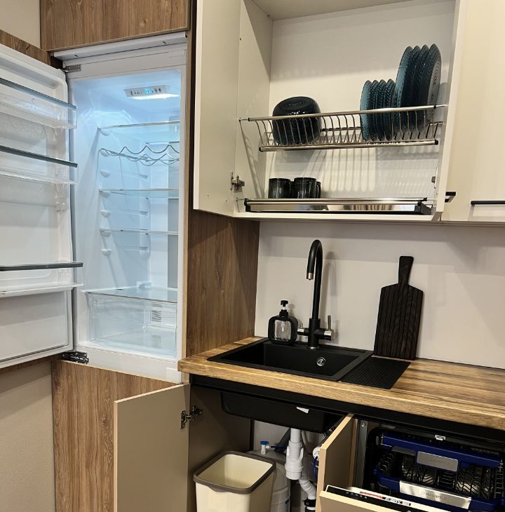 Всё для комфортного проживания: система фильтрации для питьевой воды, постельные принадлежности, посуда на 4 персоны, гладильная доска, напольная сушка, стремянка для доступа к верхним полкам.