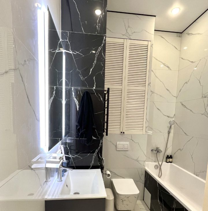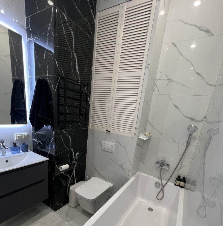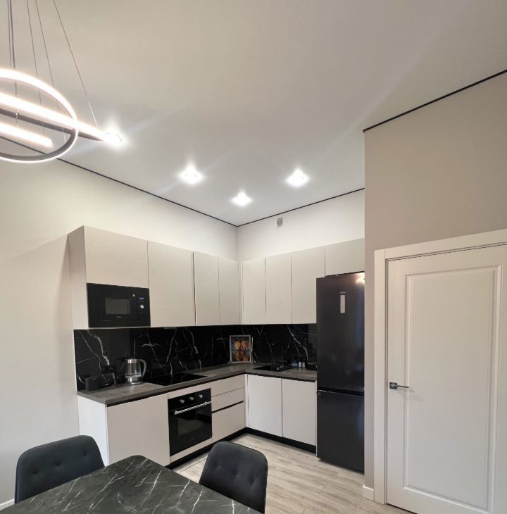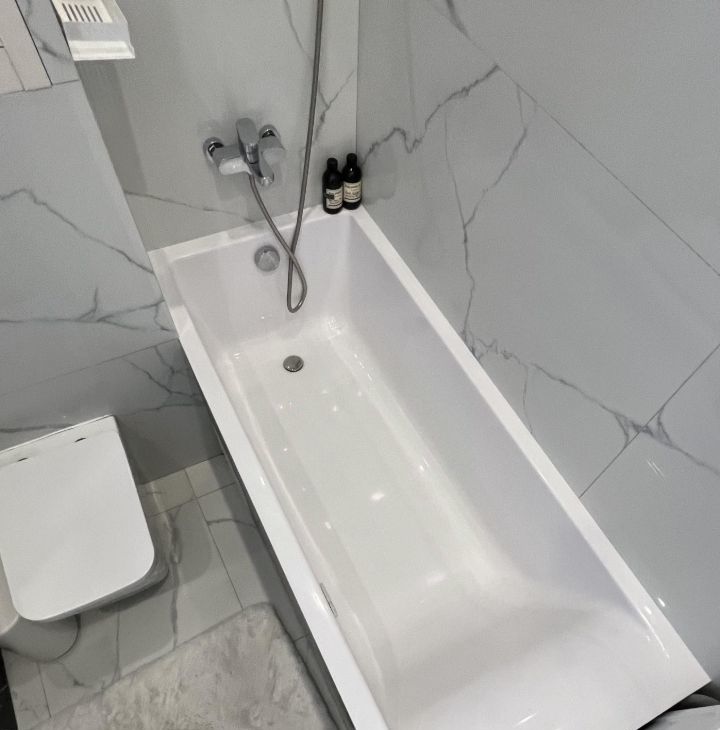- Хорошее оснащение. Есть все самые необходимые вещи: удобная кровать с хорошим матрасом, много шкафов, ванна (в которой удобно лежать и отдыхать после тяжелого дня), стиральная машина, посудомоечная машина, плита, духовка, СВЧ, чайник с регулировкой температуры, мягкий и удобный диван, стол на 4 человек (можно увеличить его, если пришли гости, чтобы вмещалось 6 человек), кондиционер, подогрев полов.
