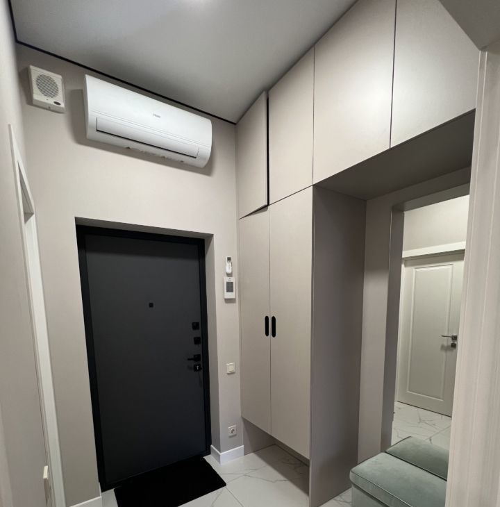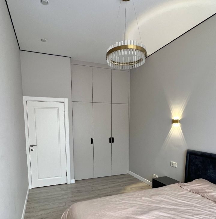 - Много места для хранения. Тут большие шкафы в прихожей, в спальне и на кухне. При этом они стильные, современные, украшающие интерьер.