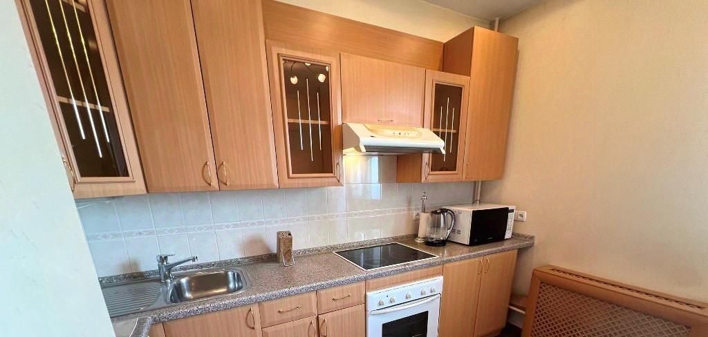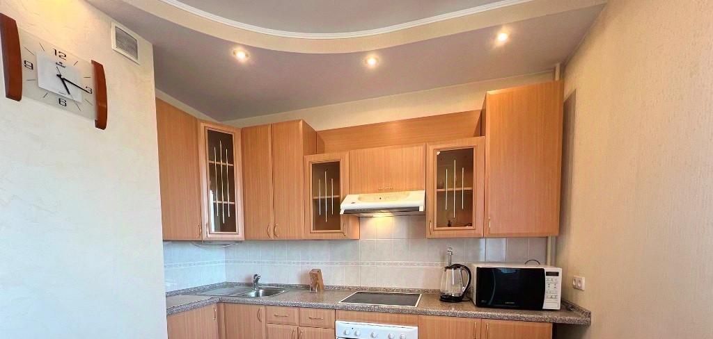 На кухне встроенный кухонный гарнитур, вместительный холодильник, СВЧ.