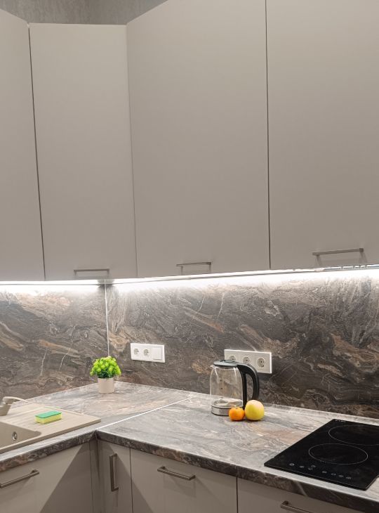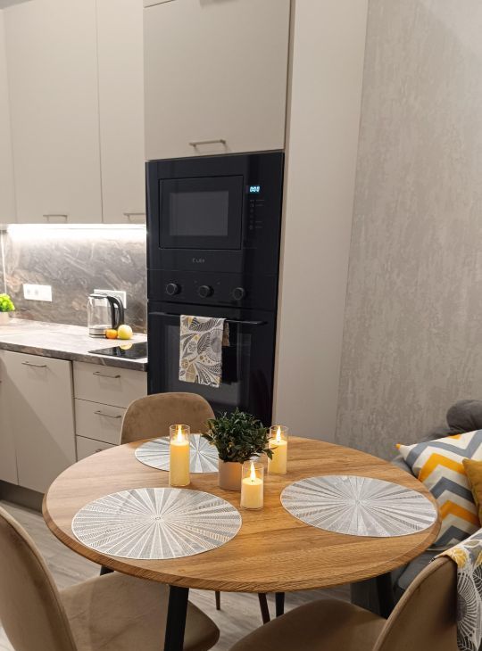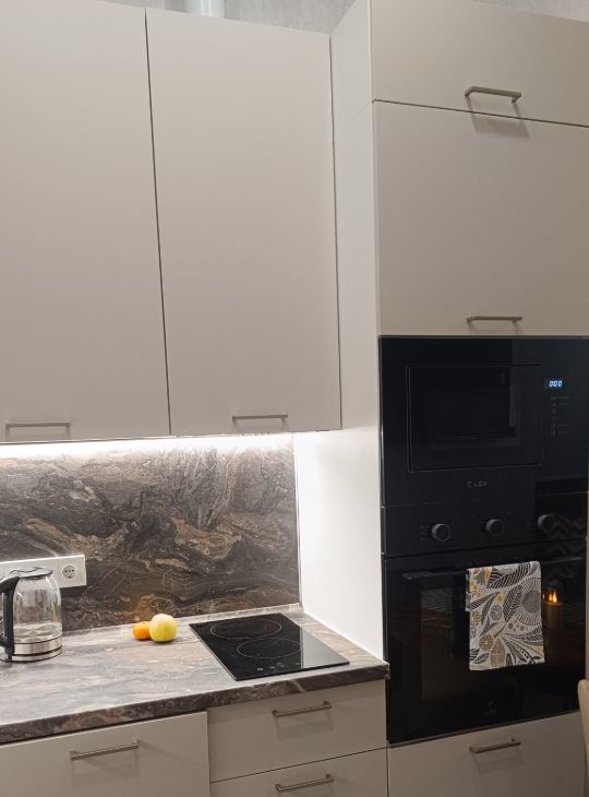 Светлая спальная комната, совмещённая кухня-гостиная, просторная ванная комната с душевым уголком. Имеется вместительная гардеробная.