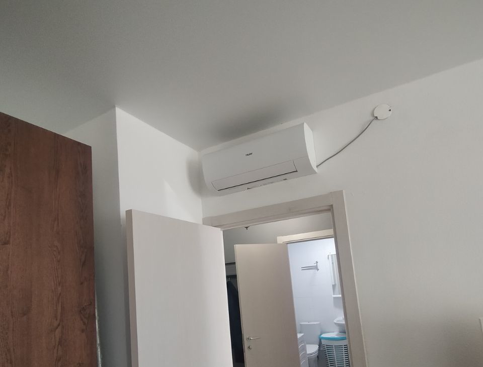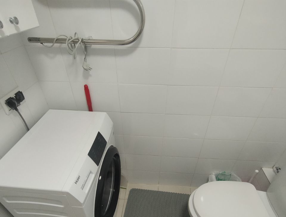 ванная комната полностью оборудована: стиральная машина Haier, полотенцесушитель.