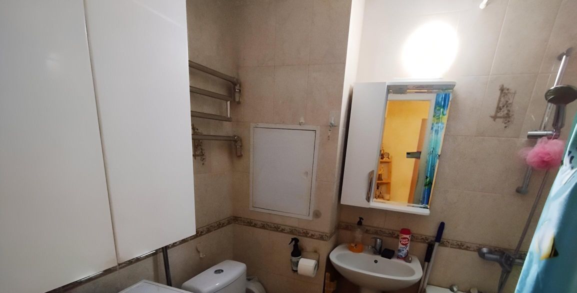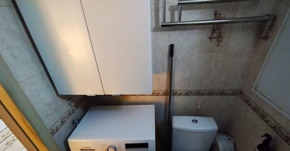 Санузел совмещённый, установлена стиральная машина.
